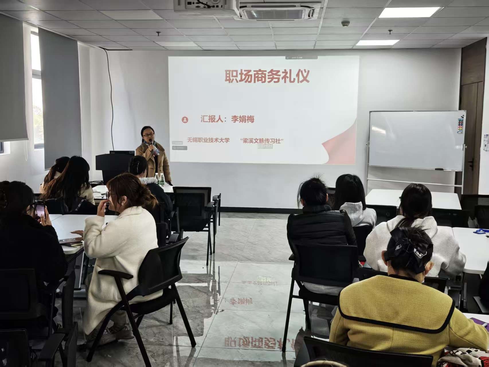 12月03日下午,为了更好地服务无锡制造业发展,传播无锡城市文化,助力锡山区企业人力资源建设,丰富企业文化内涵,无锡职业技术大学“梁溪文脉传习社”社区教育工作室成员李娟梅副教授来到吉姆西半导体科技(无锡)有限公司,为该企业各部门员工进行了一场线上+线下结合的《职场商务礼仪》专题讲座。