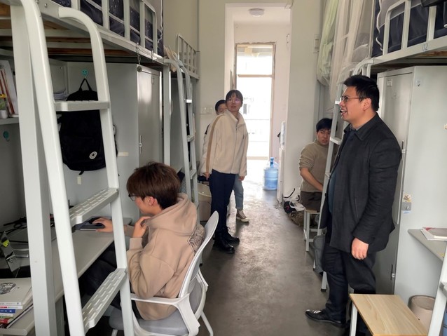 走访过程中,老师们仔细查看学生宿舍的生活设施、用电安全、校园网络等方面情况,与同学们进行了亲切的交流,详细了解他们的身心状态与日常生活情况。针对同学们提出的学习和生活问题,两位书记进行了认真解答,并叮嘱同学们要增强安全用电意识,积极参加实践活动,营造健康向上的宿舍文化。走访老师还和宿舍管理阿姨就学生反映的部分问题进行了交流。
