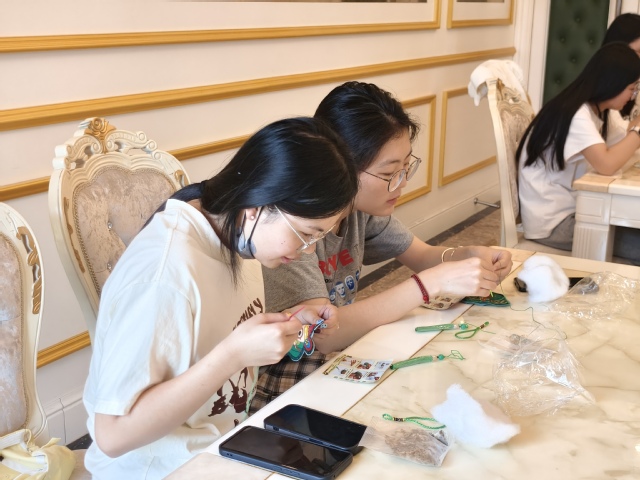 分享环节结束后,活动进入了手工制作阶段。同学们在老师的指导下,开始制作香囊和五彩手绳。穿针引线间,一个个精巧别致、带有浓郁艾草香味的香囊逐渐成型,一个个五彩手绳系在了同学的手腕,一边制作一边热烈交流,生活和学习上的难题在交流中逐渐溶解,彼此之间的感情在交流中不断升温。