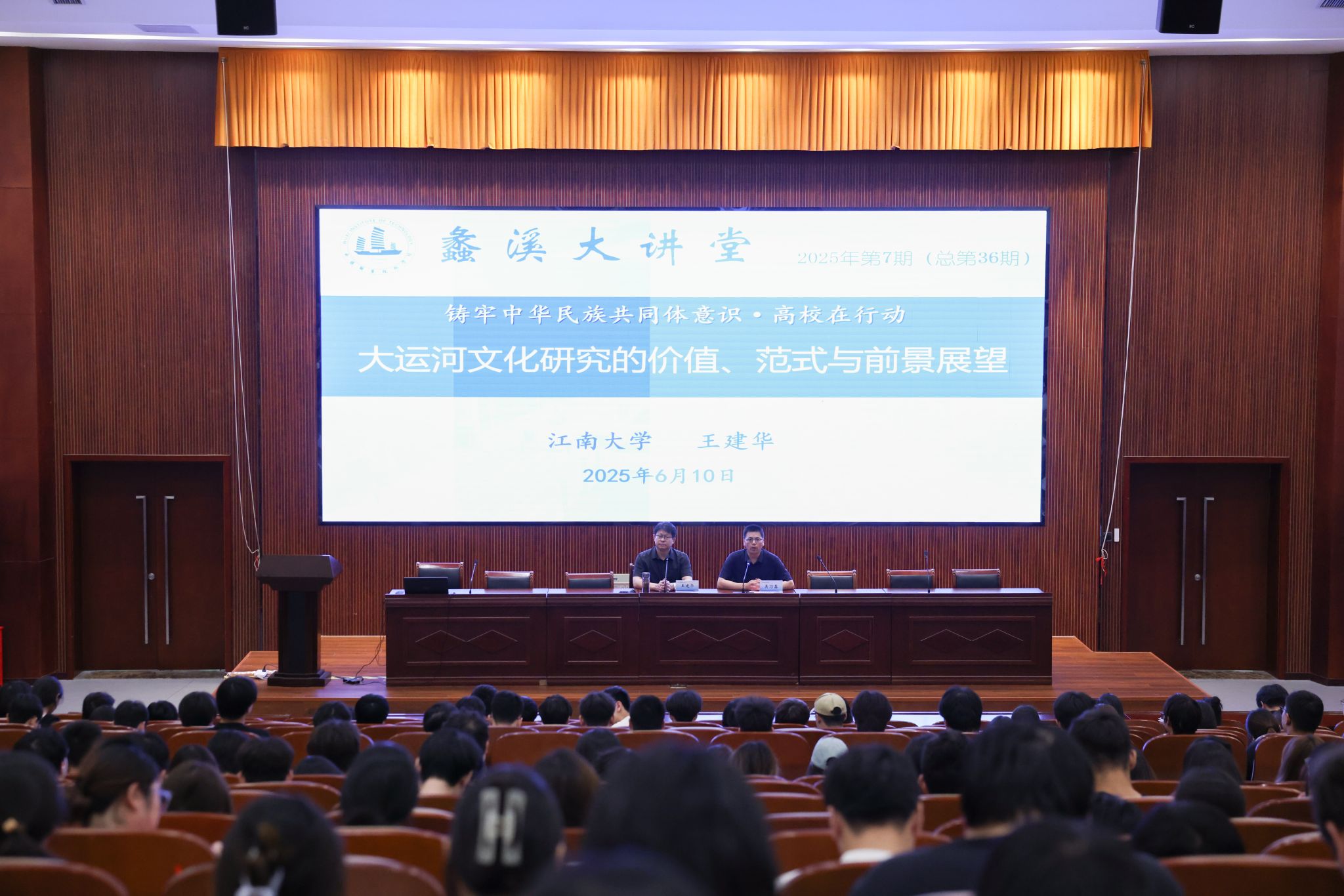 为进一步加强铸牢中华民族共同体意识教育,充分挖掘大运河深厚的历史文化底蕴,6月10日,由党委组织部、党委统战部、教务处、文旅学院联合主办的第36期“蠡溪大讲堂”在国际交流中心一楼报告厅开讲。江南大学社会科学处处长、无锡市社科联副主席王建华教授作题为“大运河文化研究的价值、范式与前景展望”的专题报告,全校300余名师生到场聆听。