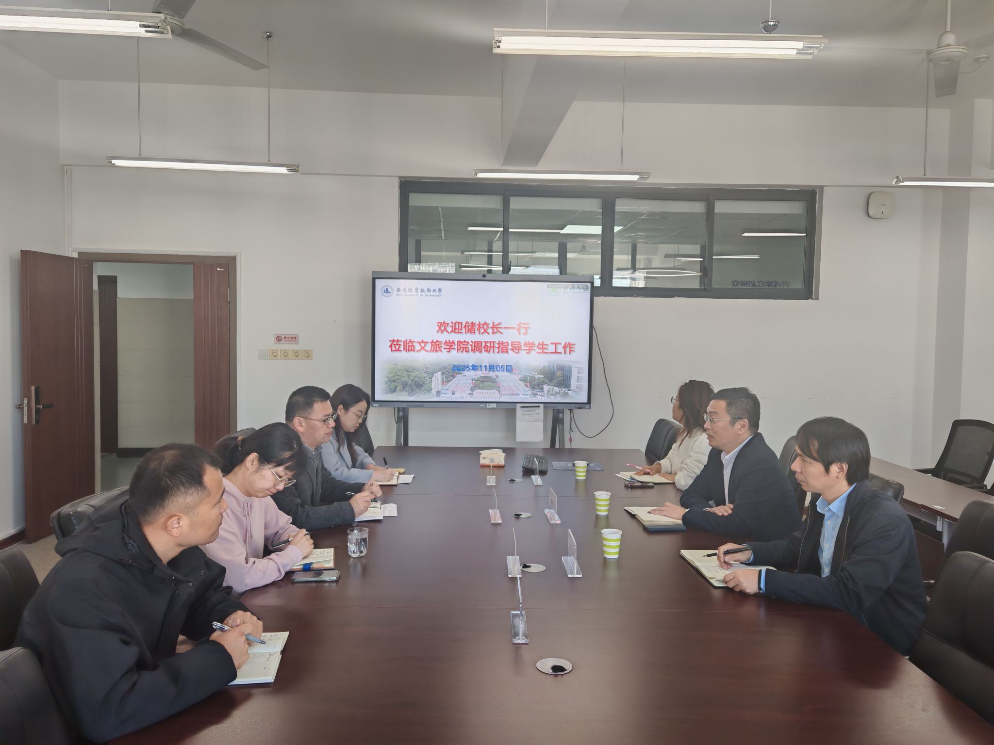 会上,学院党总支书记吴乃鑫介绍了文旅学院学生基本情况,学工办主任陈明媛就学风建设、就业保障、思想引领、社会实践、心理健康、“一站式”社区建设、打造专业氛围等方面的工作成效及主要经验做法作了详细汇报。随后,储开峰对文旅学院的学生工作给予了肯定,徐锋和丁尤蓉分别就文旅学院在学生管理工作和校园安全稳定工作方面的开展情况给予指导,并就相关问题作出回应。