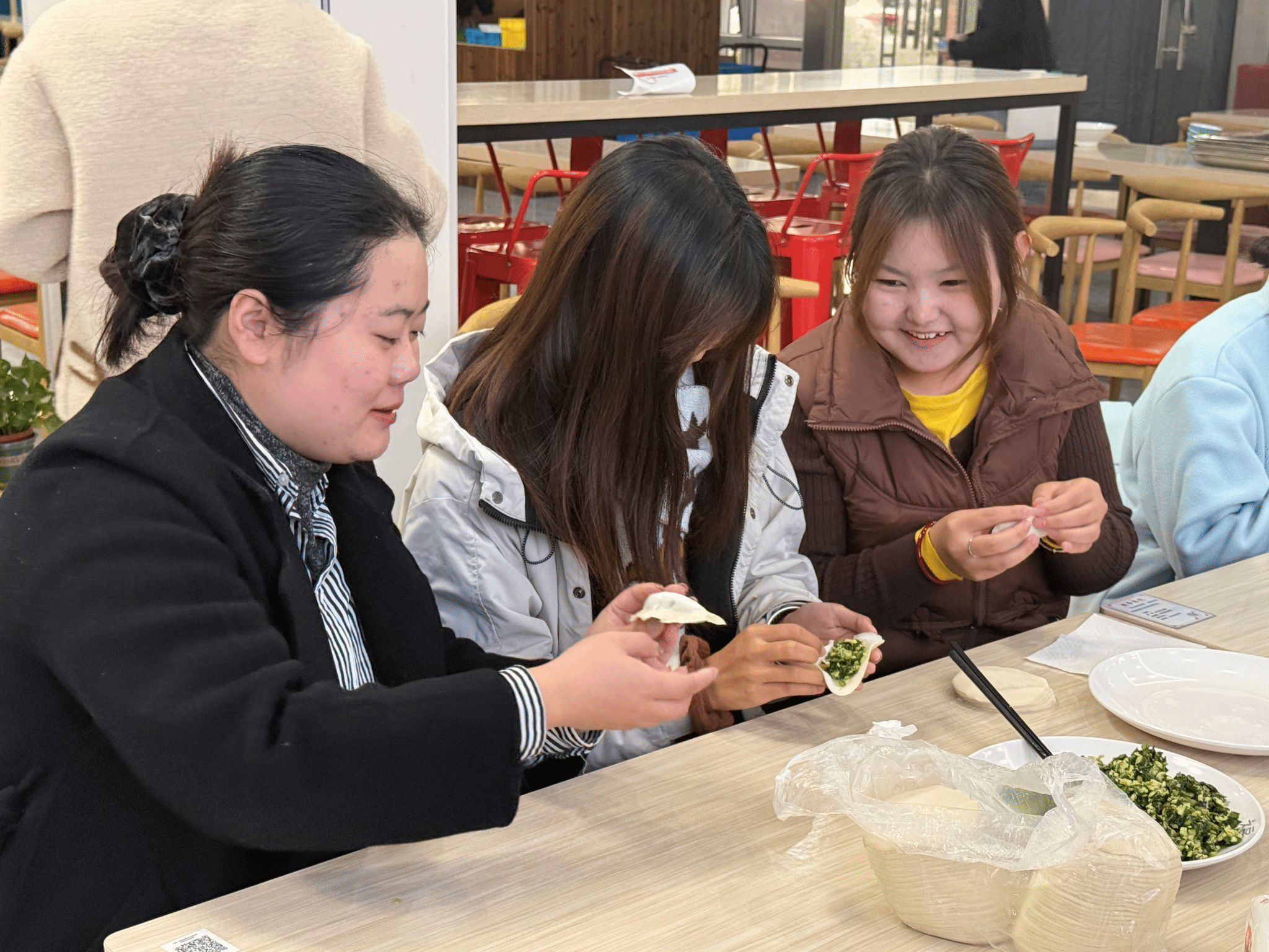 活动现场暖意融融,桌椅整齐摆放,面粉、饺子皮、馅料等食材早已准备就绪。结对师生们围坐一起,分工明确,动作娴熟者主动分享技巧,新手则在同伴的指导下认真学习。过程中,师生们边包饺子边亲切交流,时而探讨饺子的不同包法,时而分享各民族的冬至习俗,时而畅谈结对互助中的点滴趣事,欢声笑语此起彼伏。