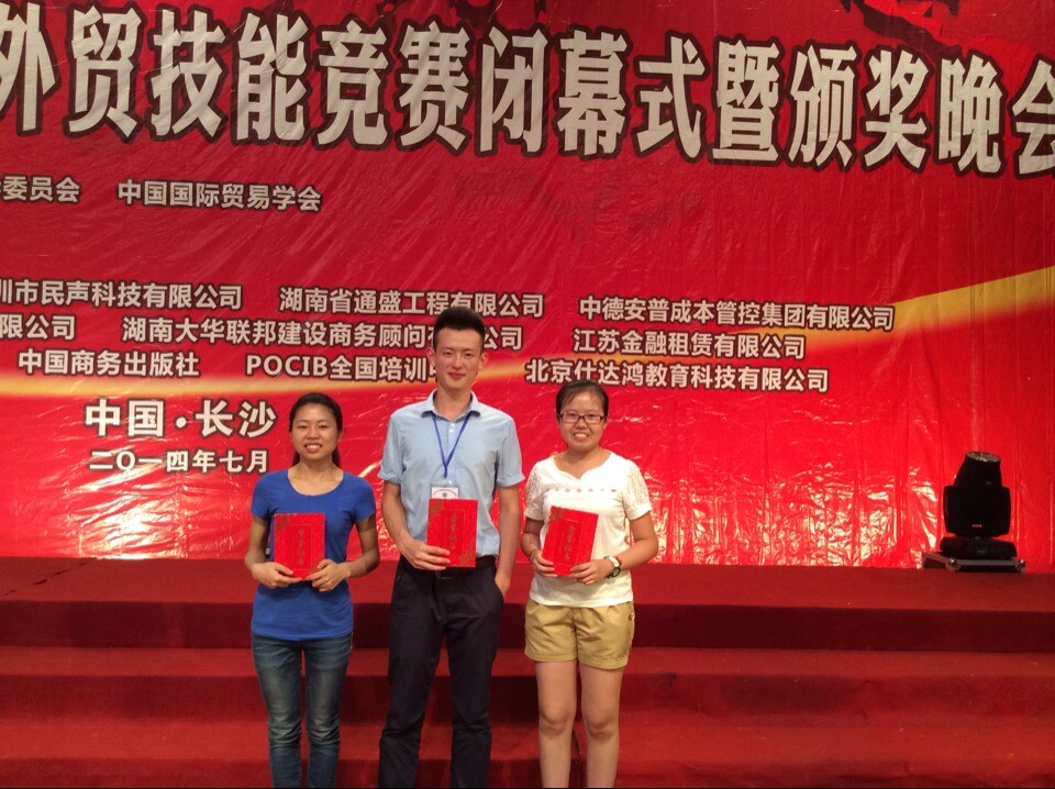 本届竞赛根据国务院关于加快发展现代职业教育的决定精神,以培养适应外经贸行业发展的高素质懂技术、有技能的复合型人才为主题,为各院校师生提供了一个展示职业教育教学成果和交流借鉴的平台。比赛分为外贸技能竞赛和商务英语口语技能竞赛两个部分,我校参赛队员经过初赛,复赛和决赛的角逐,最终商务英语61232班牛伟东同学获商务英语口语竞赛一等奖,商务英语61232班唐小芳同学获外贸技能竞赛三等奖,商务英语61232班刘子晴同学获外贸技能竞赛优秀奖, 我校代表队获得团体二等奖。(王莉群)