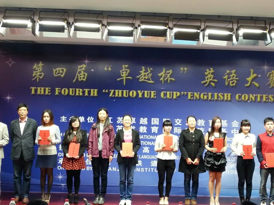 在2014年3月29日结束的由江苏省卓越国际交流教育基金和江苏省教育国际交流服务中心主办的第四届 “卓越杯”英语大赛中,我校直通车项目12级学生张海玲,周天琪同学荣获二等奖并各获2000元奖学金,陆斌,张蓓丽荣获三等奖并各获1000元奖学金,陈琳,吴德,许云凤,王艺,徐婷婷荣获优胜奖并各获500元奖学金。(指导教师: 王叶方,许静。)