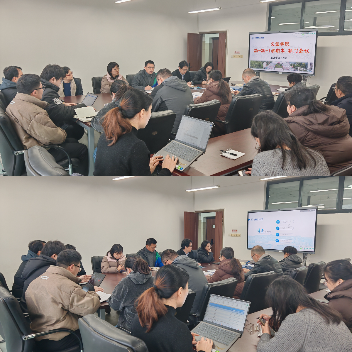 1月20日下午,文旅学院在GJ-604教室召开2025-2026学年第一学期期末部门工作会议。会议由党总支书记吴乃鑫主持,学院全体教师参加。
