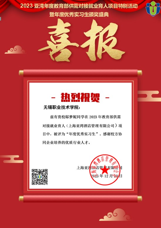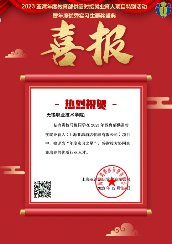 日前,在上海亚湾举办的教育部供需对接就业育人项目暨年度优秀实习生颁奖典礼中,我院酒店管理专业马俊、邸梦妮两名同学在千名实习学生中脱颖而出,分别获得“年度实习之星”和“年度优秀实习生”嘉奖。