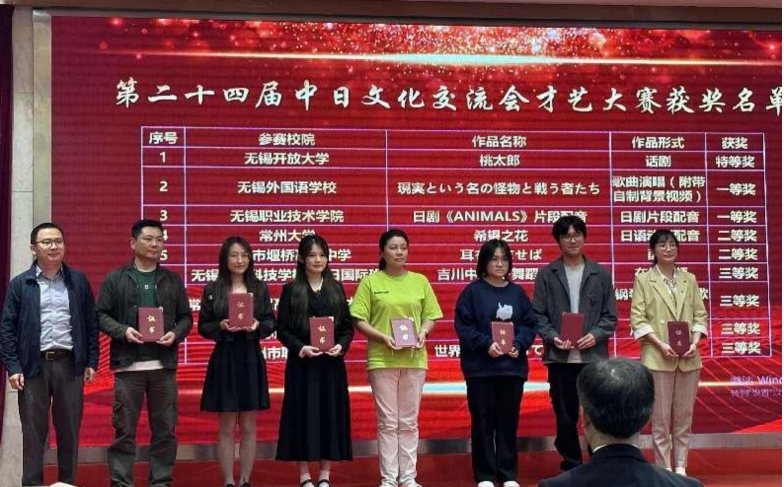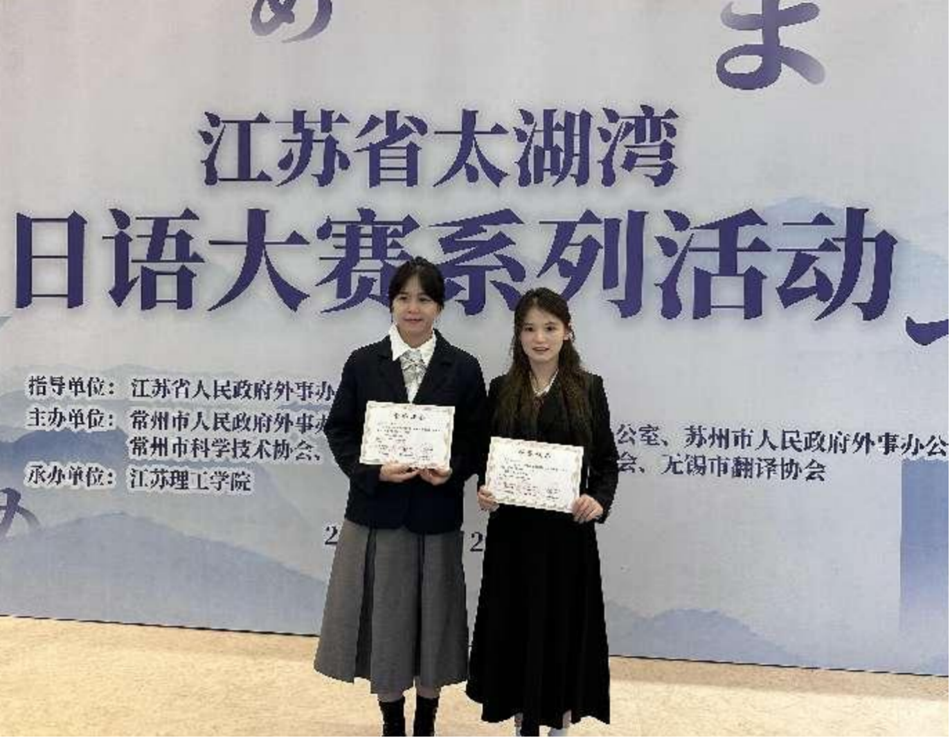 作为本次系列赛重头戏的太湖杯日语演讲大赛,我校商务日语专业两位学子在指导老师刘金凤、张理夏和外教西山阳子的悉心指导下,在专科组比赛中表现出色,取得了本次大赛特等奖1项、一等奖1项。由张虞昕、沈倩昉、张华清老师指导的日剧片段配音节目获才艺大赛一等奖。日语教学微课大赛中张虞昕老师的“乡村振兴背景下景区日语标志语误译分析”获得“江苏省太湖湾第4届日语教学(微课)大赛”特等奖。此外,由于我校积极参与、组织严谨、成绩突出,荣获“先进集体”的称号。