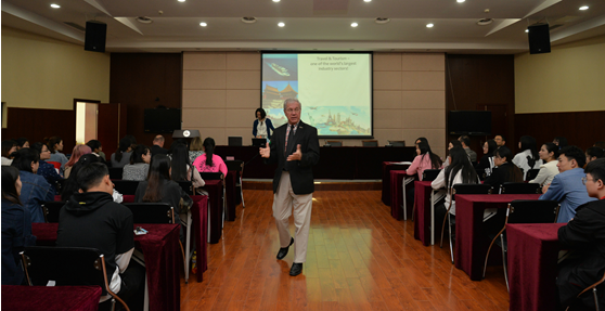 项目组首席资深学术顾问圣地亚哥州立大学旅游与酒店管理学院教授Gene Lamke(杜靖德)首先为我院酒店管理专业的师生们以“客户服务与酒店旅游业入门”为主题进行课堂教学演示。演示课上,杜教授风趣幽默、活跃开朗的教学风格以及积极邀请学生进行课堂讨论及互动的授课方式让教师们受益匪浅,同时,有关如何创造出卓越的对客服务、酒店行业所需的技能体系以及“The Extra Degree”(“增加一度”)成就卓越人生的哲理故事等教学内容,也给师生们留下了深深的印象和启迪。